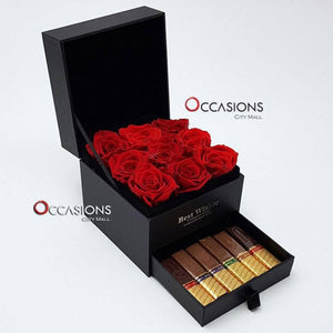 Red roses, with a drawer filled with Merci chocolate, and presented in a very special elegant way.