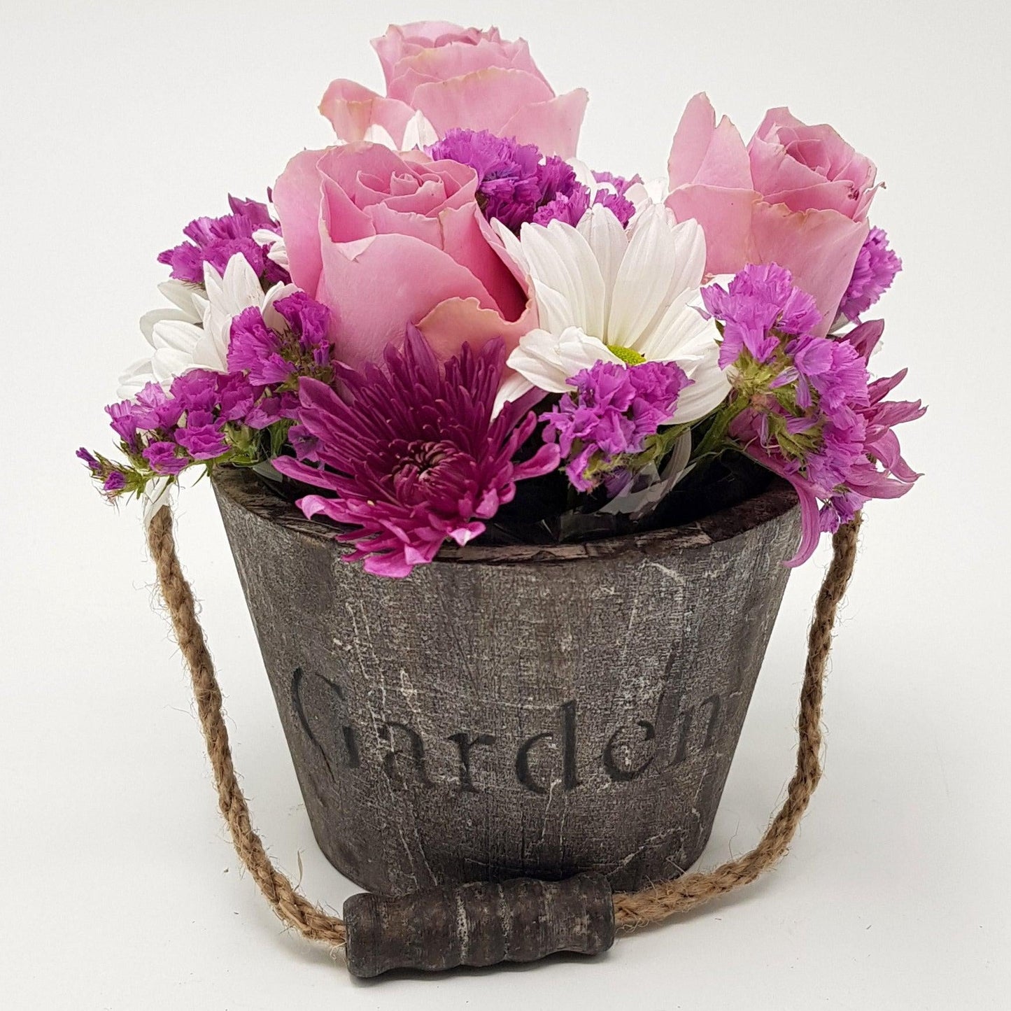 Simple mixed flowers in a wood basket