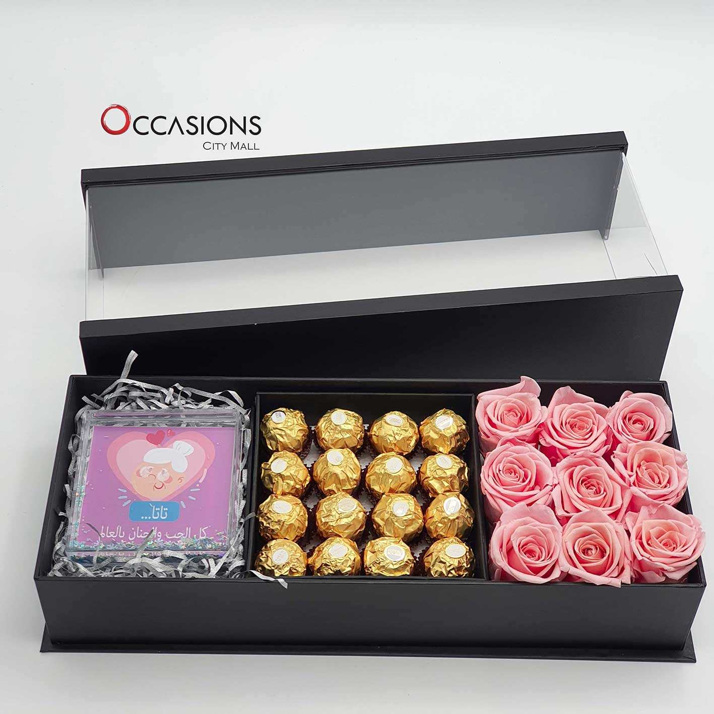 An acrylic box with three sections including pink fresh roses, ferrero roses and a Grandma frame تاتا كل الحب Perfect gift for Mother's celebrations like Mother's day , Mother's birthday and more.