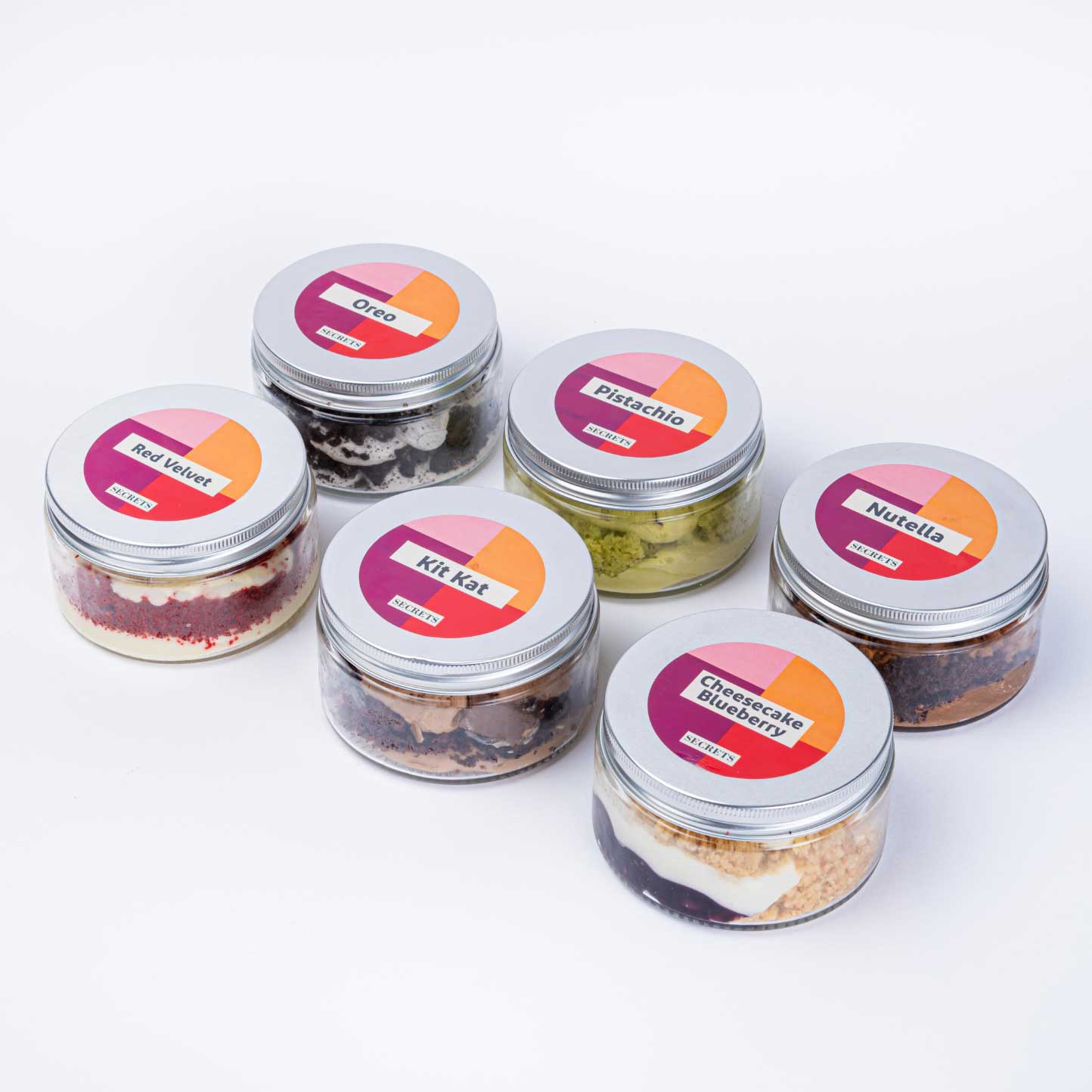 Six Jars of cake ( Nutella, Red Velvet, Oreo, kitkat, Blueberry Cheesecake, Pistachio)