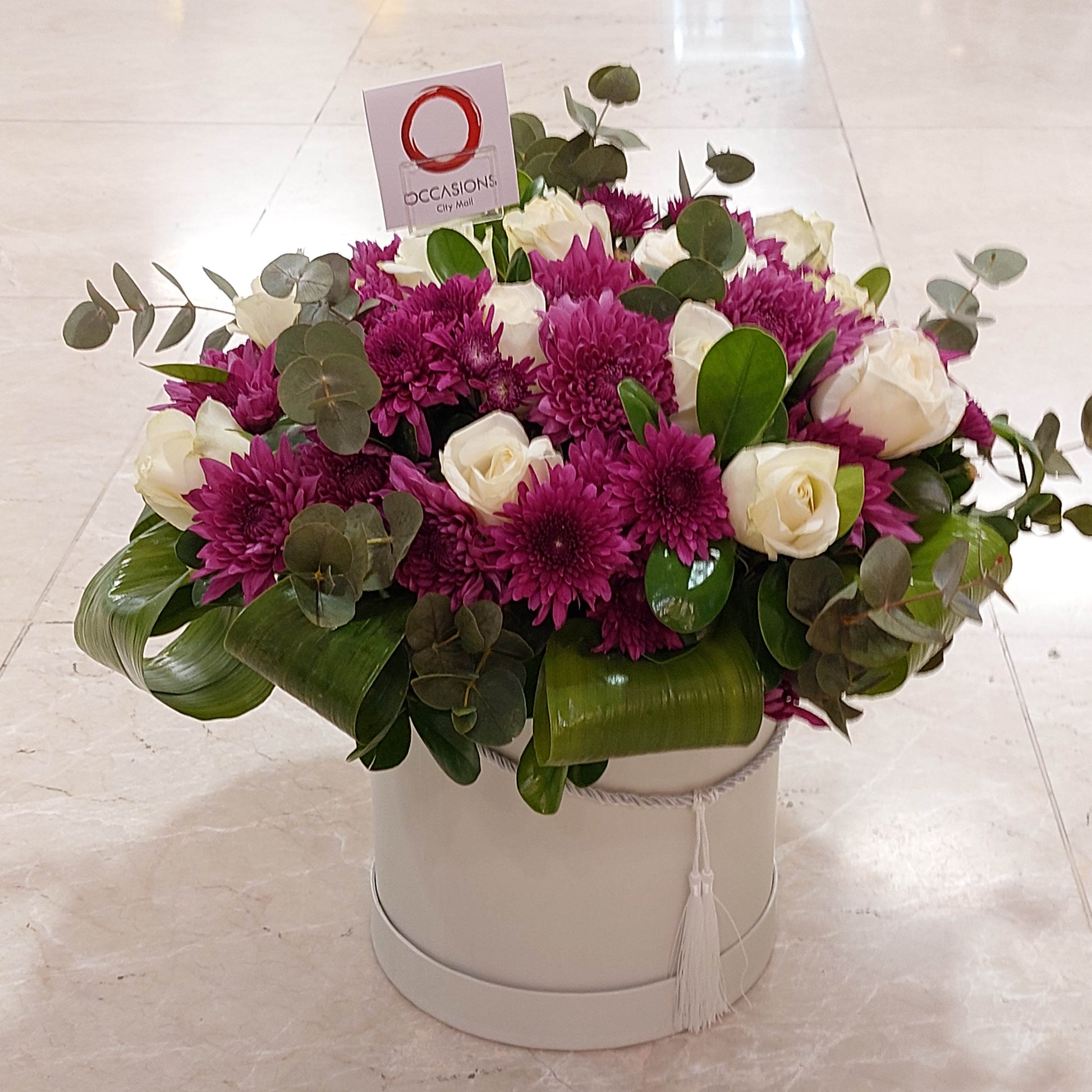 Beautiful purple with mixed flowers filled in an elegant box surely for someone is special for you