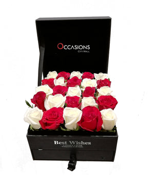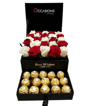 A black box packed with red and white roses and Ferrero chocolate drawer.